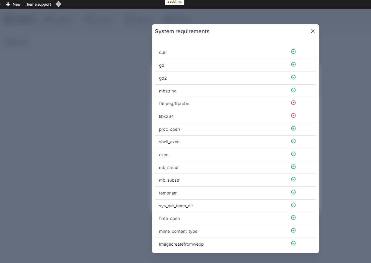 I am running aaPanel on Ubuntu 22.04, and I am encountering errors related to system requirements during the activation of WordPress plugin. Specifically, the errors mention ffmpeg/ffprobe and libx264.