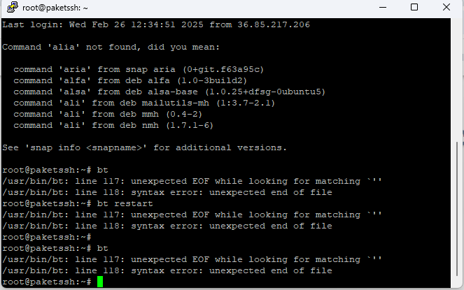 aaPanel_Kern Hello, please try using this command is it possible to execute the bt command? bash /www/server/panel/init.sh If there is still an error, you can execute this command to re-download the file and then execute it wget --no-check-certificate -O /www/server/panel/init.sh https://www.aapanel.com/install/src/bt7_en.init && bash /www/server/panel/init.sh aaP_llasmmmmsssnq