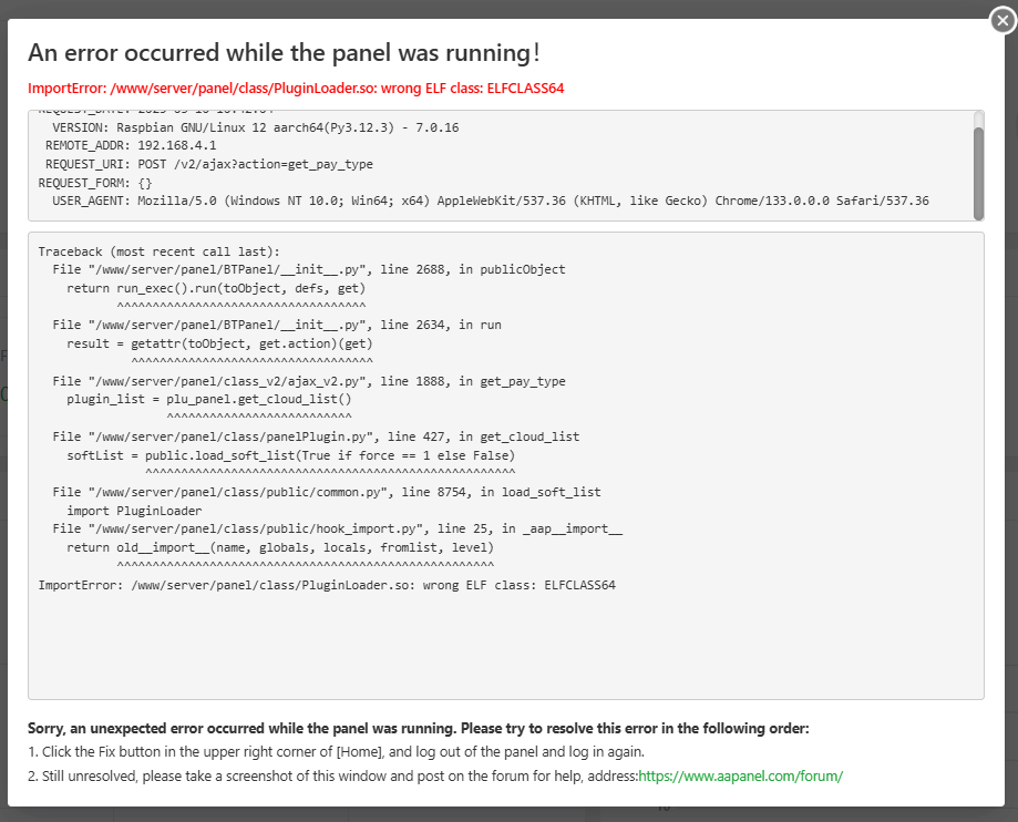 aaPanel_Kern Hello, we have not carefully tested raspberry pi 4, is it normal to delete the /www/server/panel/class/PluginLoader.so file and then restart it? bektigalan