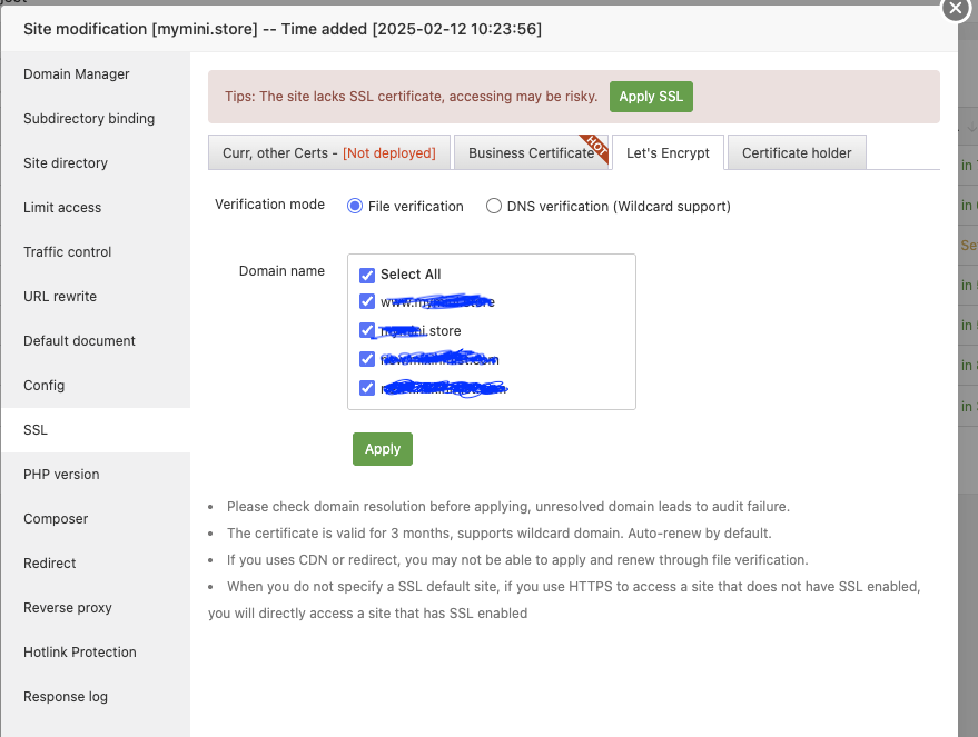 this image is of before applying ssl , after applying we got no option to appply ssl to other domain.