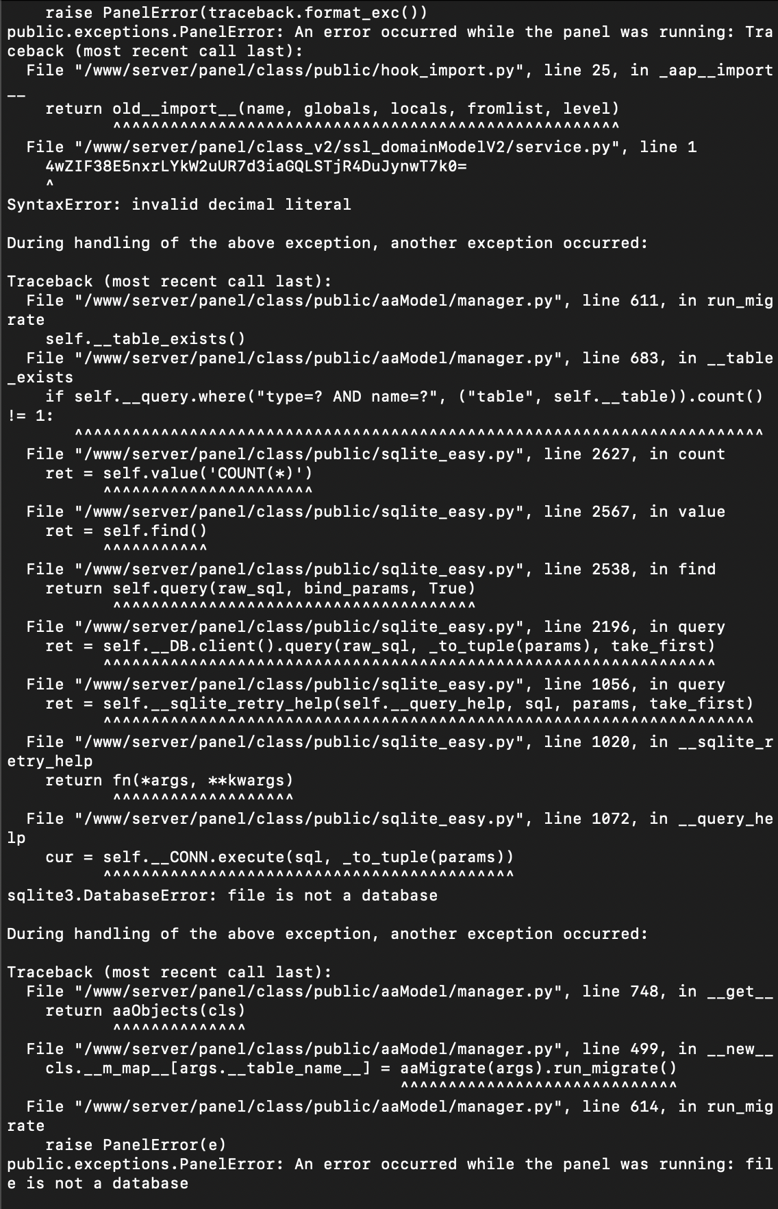 Try to find under /www/backup/panel/ latest compressed files Then extract out to find the data/default.db The file cover /www/server/panel/data/default.db The restart the panel again whether can solve?