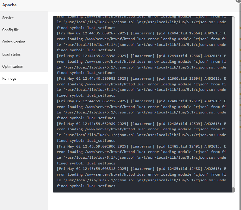 [Fri May 02 12:25:55.978328 2025] [lua:crit] [pid 12494:tid 12586] [remote 196.250.65.128:19200] AH01477: lua: Failed to obtain lua interpreter for entry function 'run_btwaf' in /www/server/btwaf/httpd.lua