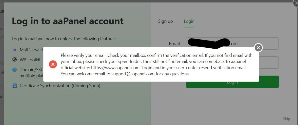 I tried logging into my aaPanel account on my server several times, but I never received any verification email from aaPanel. I've checked my inbox, spam, and all relevant folders, but there's nothing. I've tried four times at different times. How can I fix this?