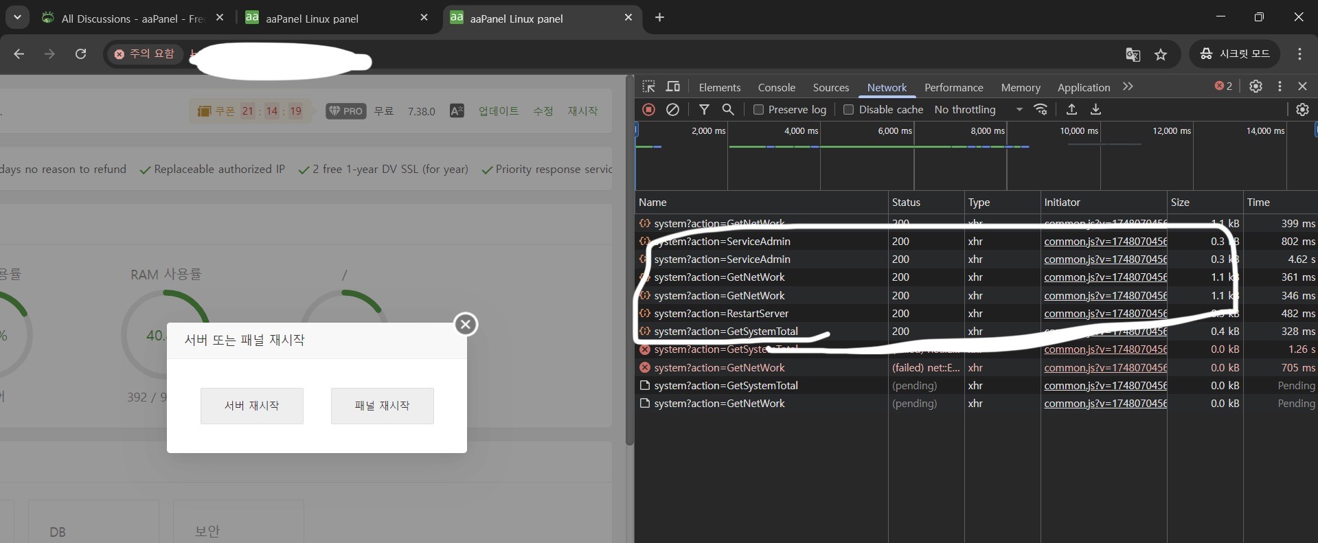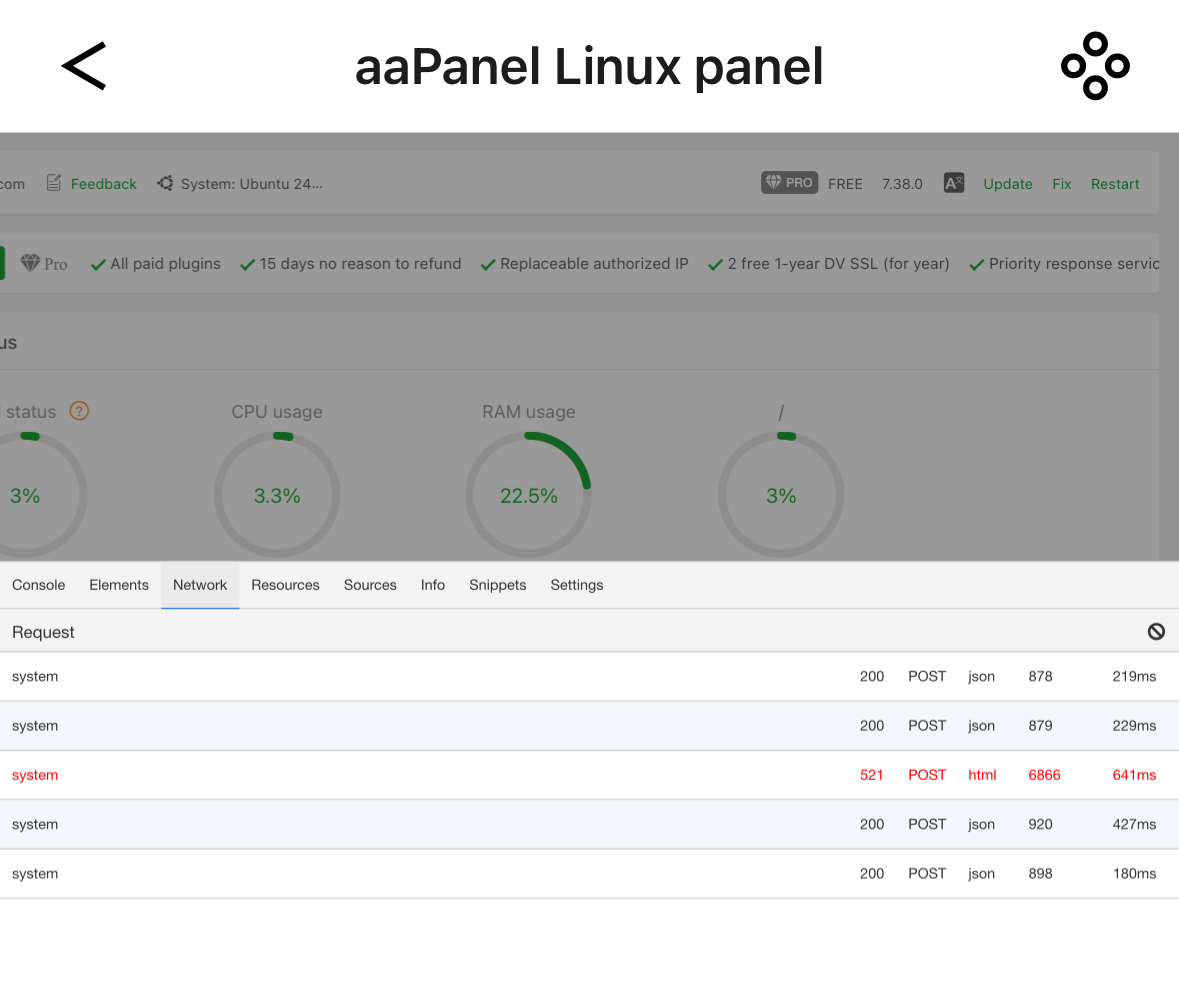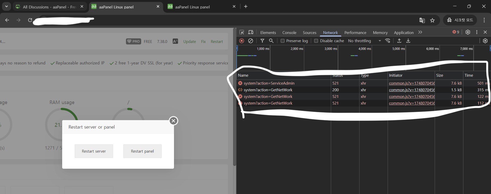 Clicking the “Server Restart” button on the Home page fails if the panel is behind a Cloudflare proxy. The browser shows 520 or 521 errors, which are returned by Cloudflare. The restart only works after disabling the proxy.