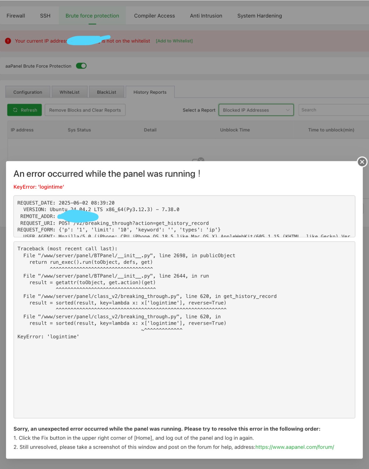 When navigating to Brute Force Protection > Blocked IP Addresses in the beta version, a KeyError related to the missing field logintime appears, and the list fails to load.