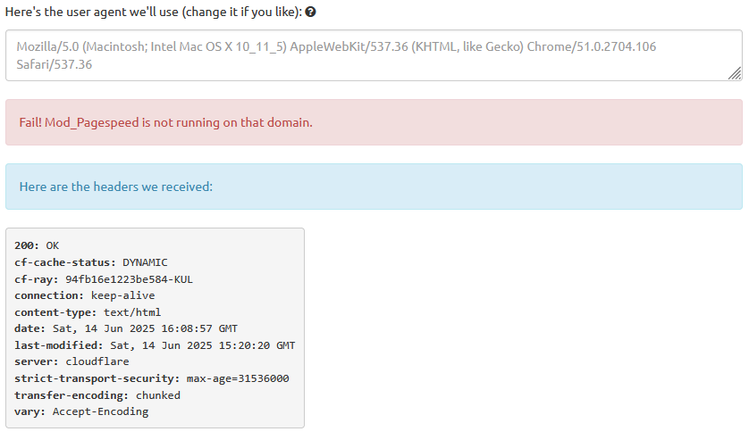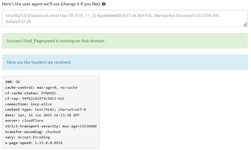 Check headers or https://ismodpagespeedworking.com/ to verify PageSpeed Module status.