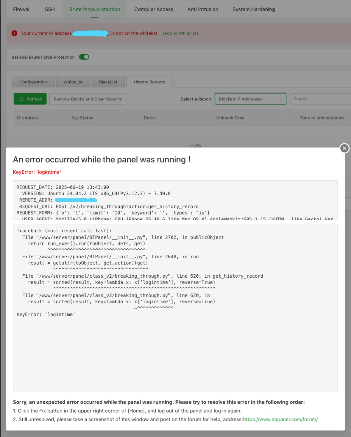 KeyError: 'logintime' — when accessing Brute Force Protection > History Reports