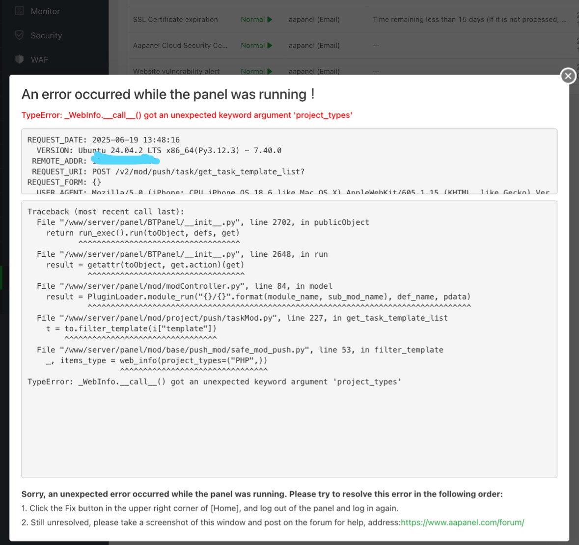 TypeError: _WebInfo.call() got an unexpected keyword argument 'project_types' — occurs when trying to add a system alert task in the “Notifications” settings tab