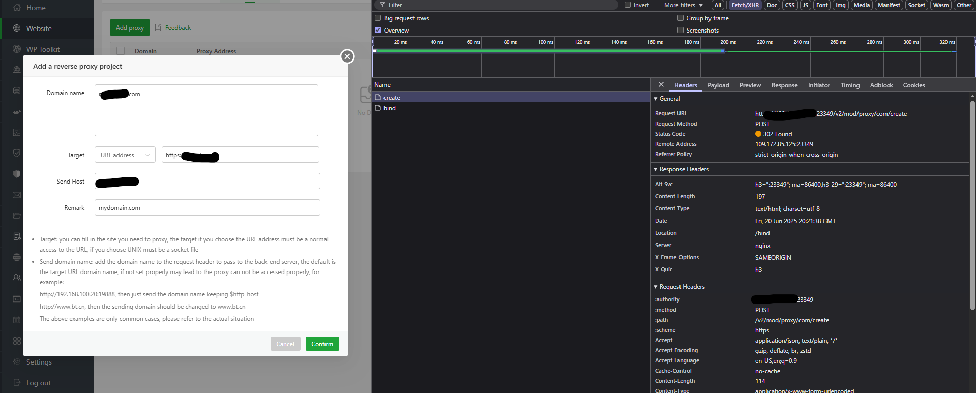 aaP_stevel9 I've tried to add a domain to the proxy manager for reverse proxy, but it doesn't work. instead in network tabs I get route not found and the config file not created. It's a fresh install Ubuntu: 24 Aapanel: 7.0.20 Nginx: 1.24