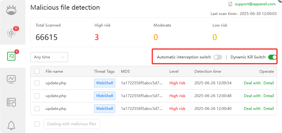 to clean the warnings from the GUI, clean the detentions log files at `/www/server/panel/data/safeCloud/log``, these will clear the warnings in the plugin.
