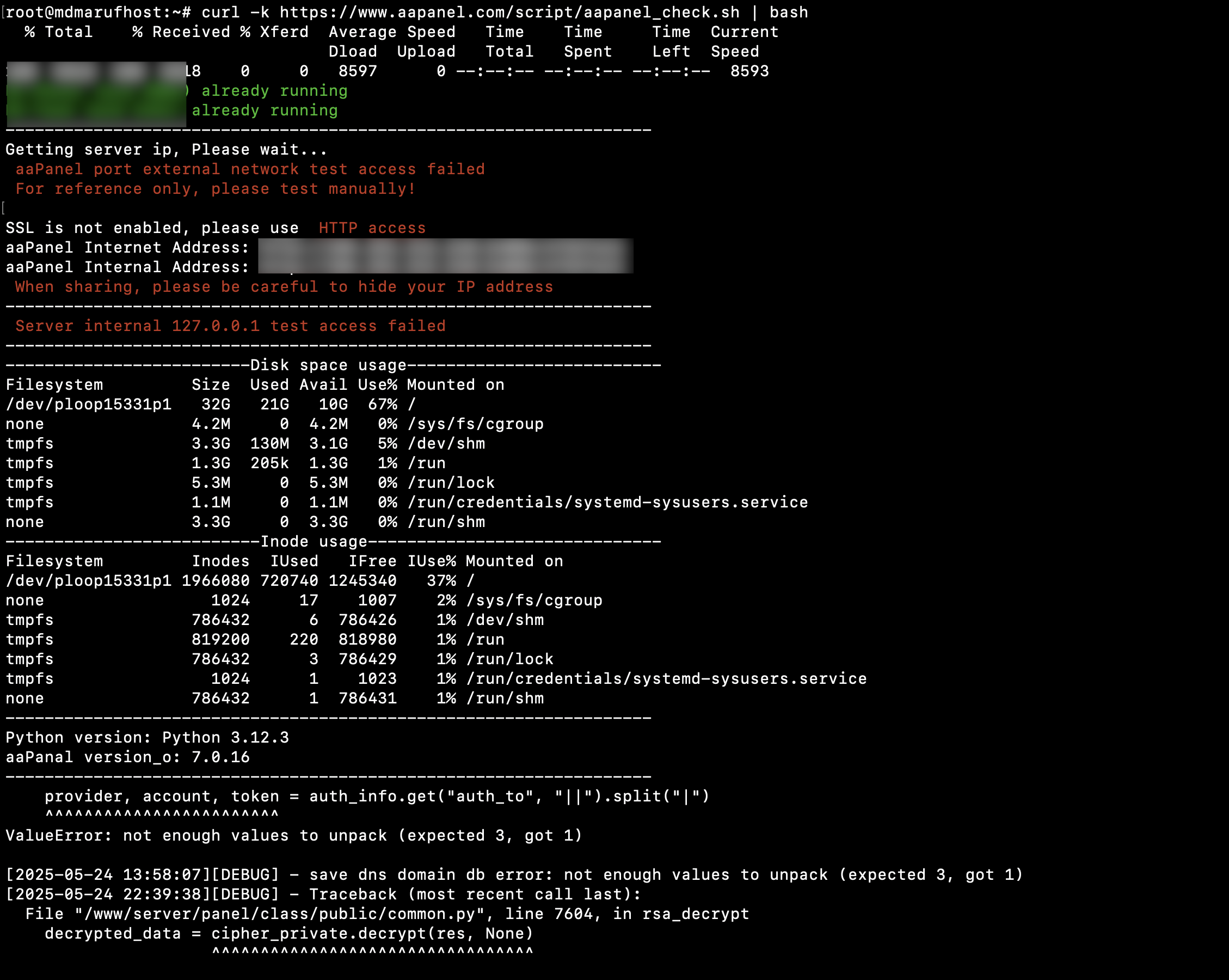 aaP_mohammadmaruf020 i was using the aapanel from last 7-8 months it was worked also last night but tonight its not possible to access could u please assist me how to resolve it. i was run this command curl -k https://www.aapanel.com/script/aapanel_check.sh | bash to check the status here is the output be like