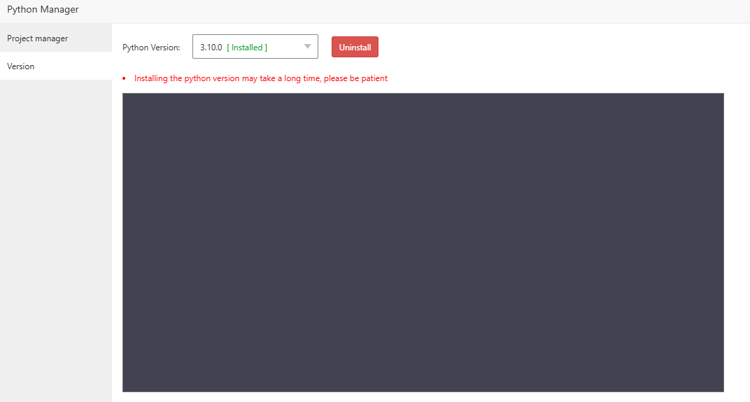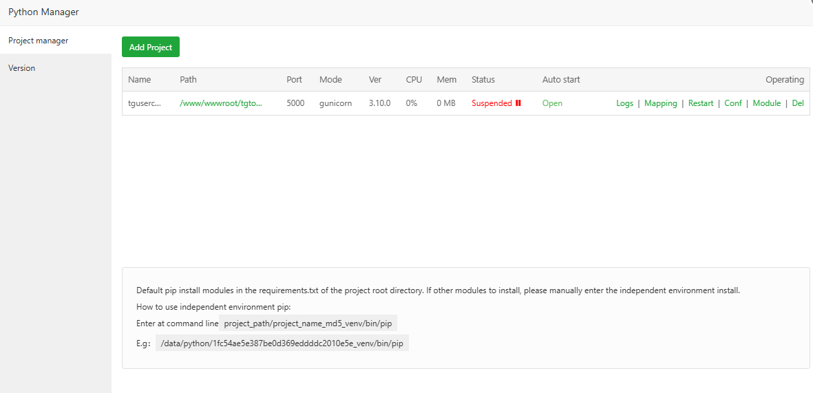 I’m encountering an issue with a Python project managed via the Python Manager interface. The project fails to start and shows the following message: