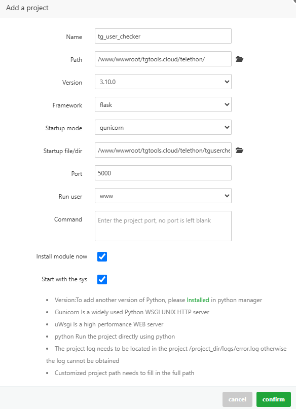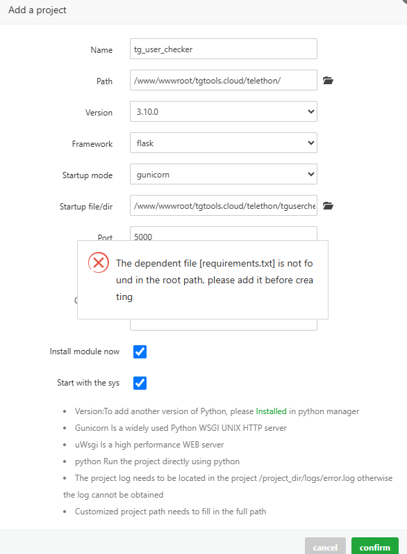 nohup: failed to run command '/www/wwwroot/tgtools.cloud/telethon/baf12f2f431ba40473d976d2333e3f88_venv/bin/gunicorn': No such file or directory