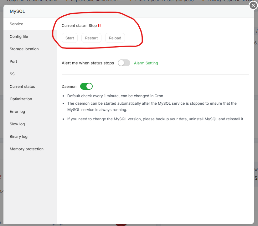 I’m facing an issue with MySQL (MariaDB 11.4.4) on my VPS using aaPanel. The service shows as stopped in the panel, and when I try to start it, it doesn’t work properly.