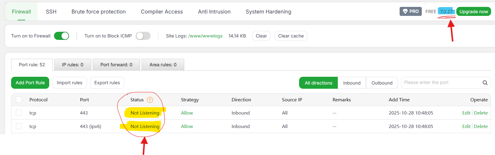 - After installing aaPanel 7.0.26 and setting up OLS, the server does not have port 443 listening, which breaks HTTPS/SSL functionality.