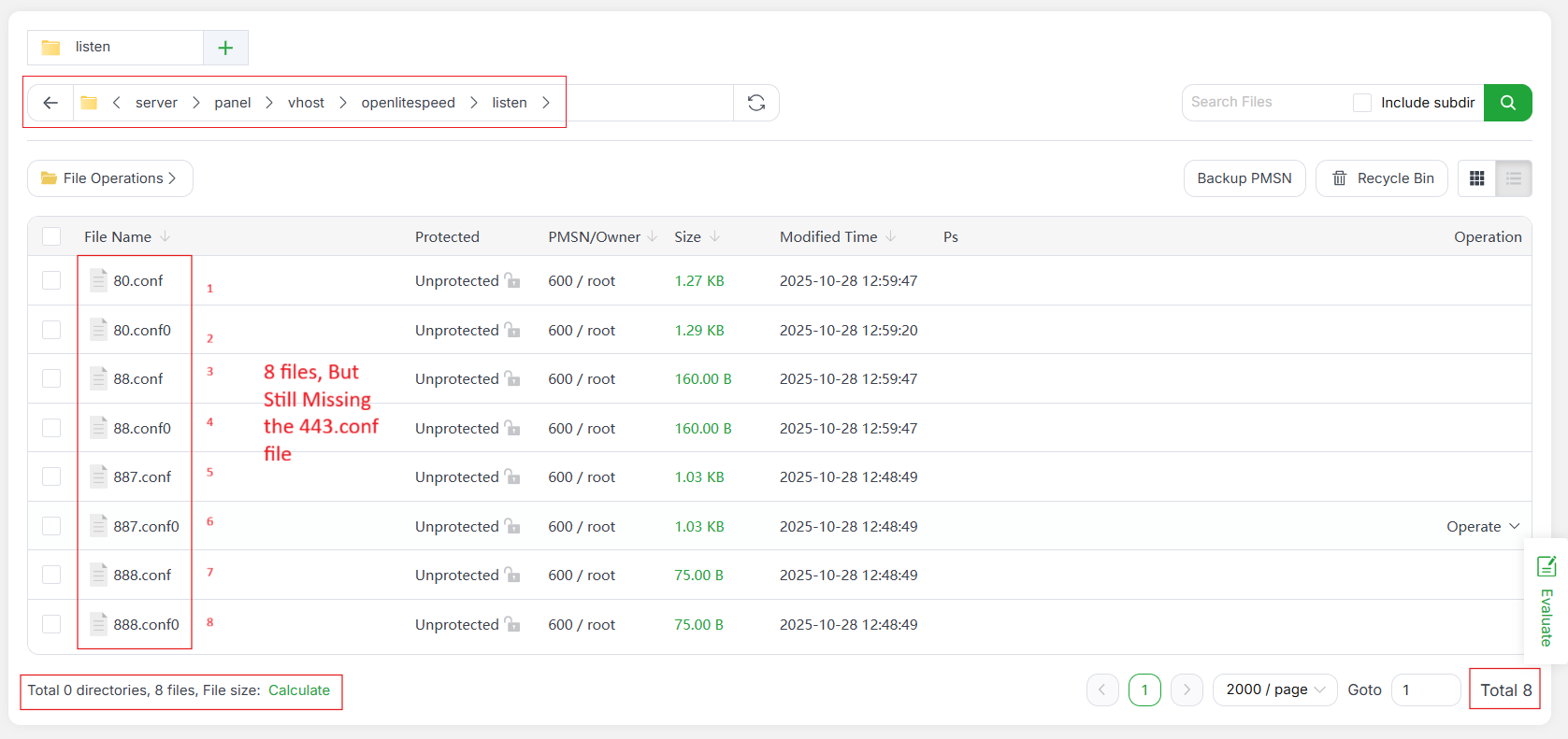 /www/server/panel/vhost/openlitespeed/listen does not include a 443.conf file, unlike previous installations on older servers where this file was automatically created.
