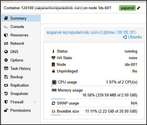 aaP_kotakomputer.ceo Load Status of aaPanel (Ubuntu 22.04) on LXC Container show 106%, because reading Node Load instead CT load. If we look at Proxmox-CT-Summary then CT show the correct value. Hope aaPanel uses this CT CPU Usage rather than "Node CPU Usage".