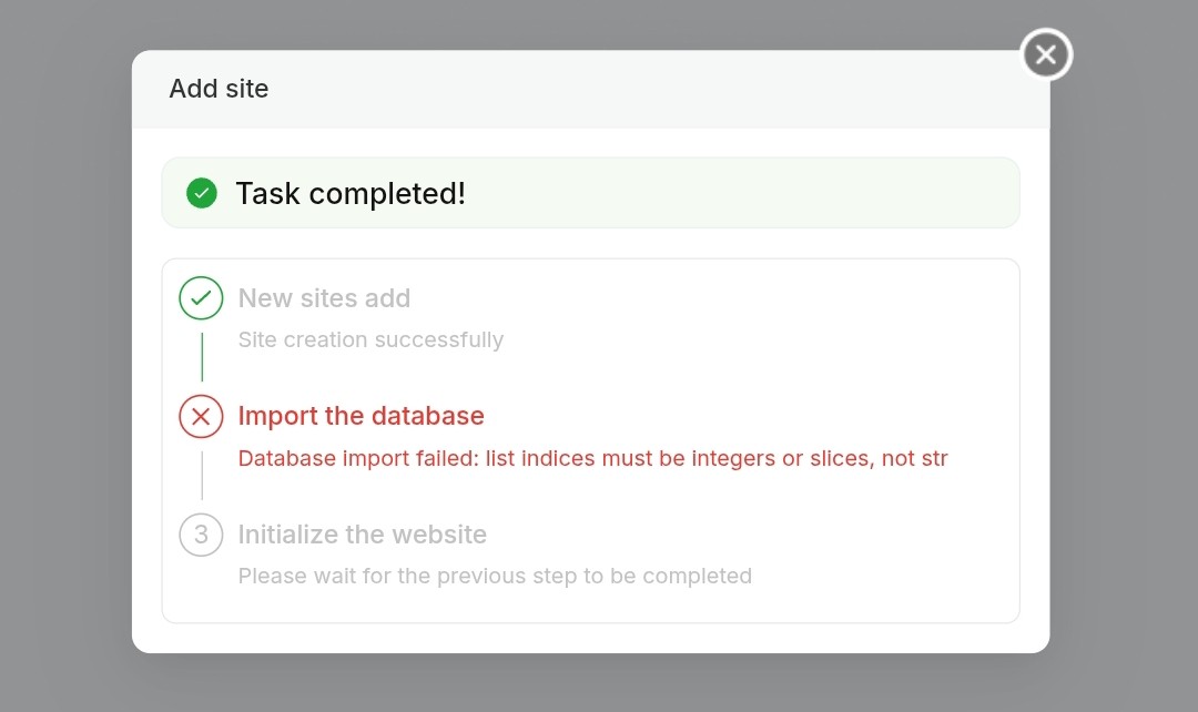 When I try to import the backup using WP Toolkit on my new VPS, the file upload works — but the database import fails with this error message: