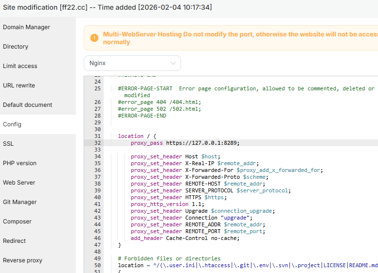 Does your website deploy SSL? Try modifying the Nginx configuration of this site to use https and port 8289