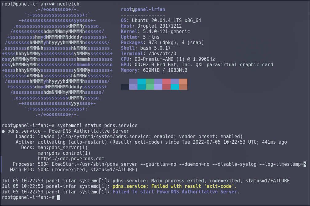 Process: 226721 ExecStart=/usr/sbin/pdns_server --guardian=no --daemon=no --disable-syslog --log-timestamp=no --write-pid=no (code=exited, status=1/FAILURE)
