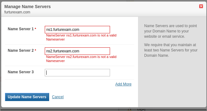 then bigrock panel update Name Servers Error : NameServer ns2.furturexam.com is not a valid Nameserver