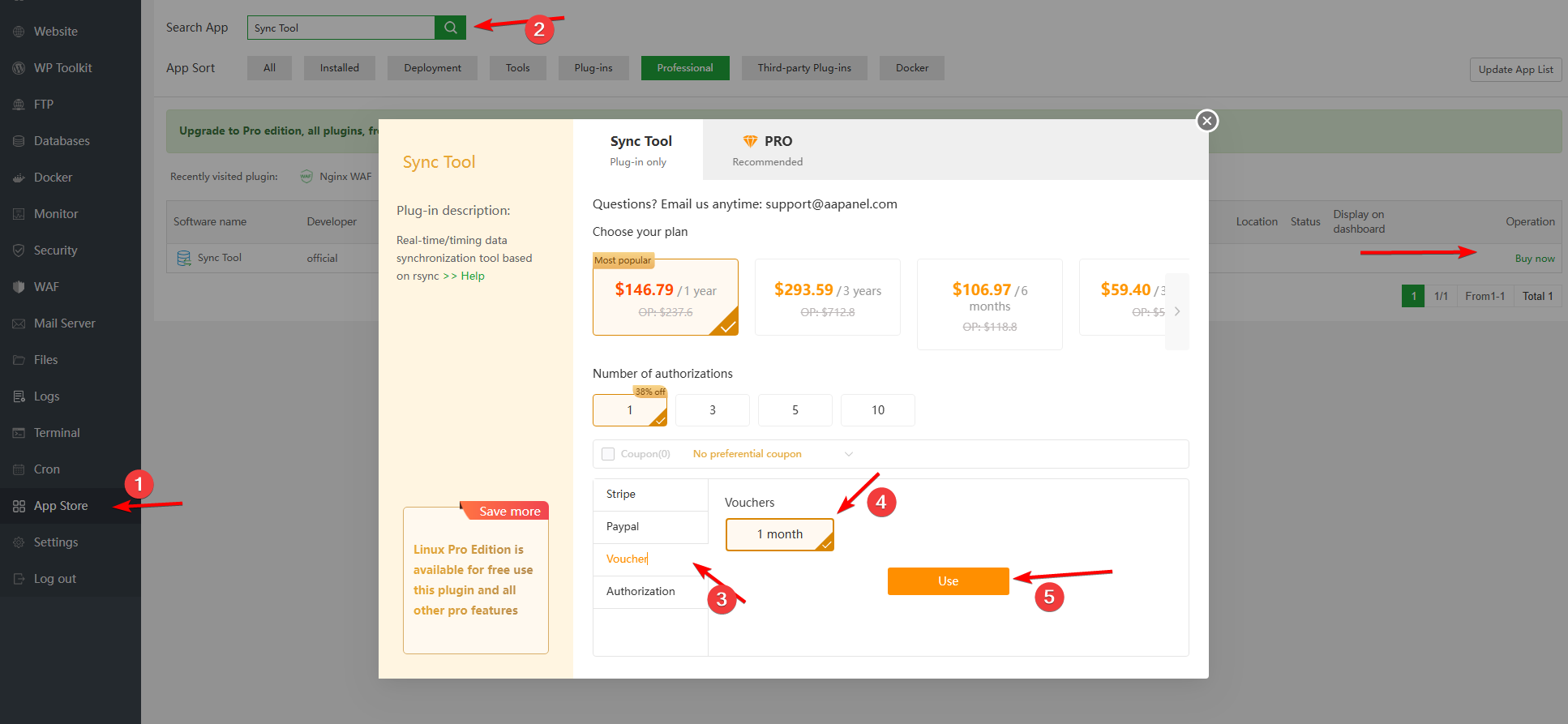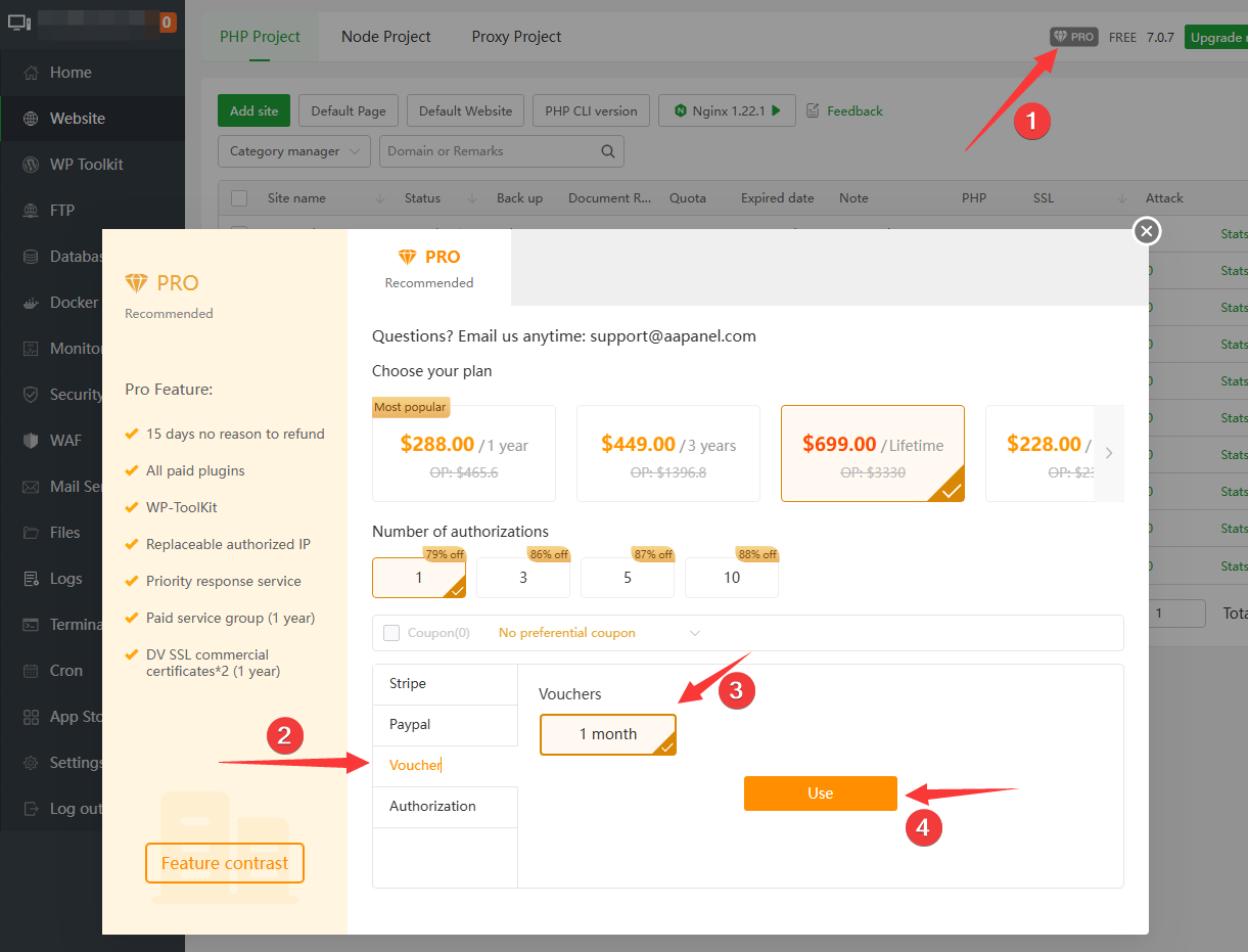 Log in to your aapanel account on the panel, Find PRO in the upper right corner and click and choose to Use the Voucher to pay