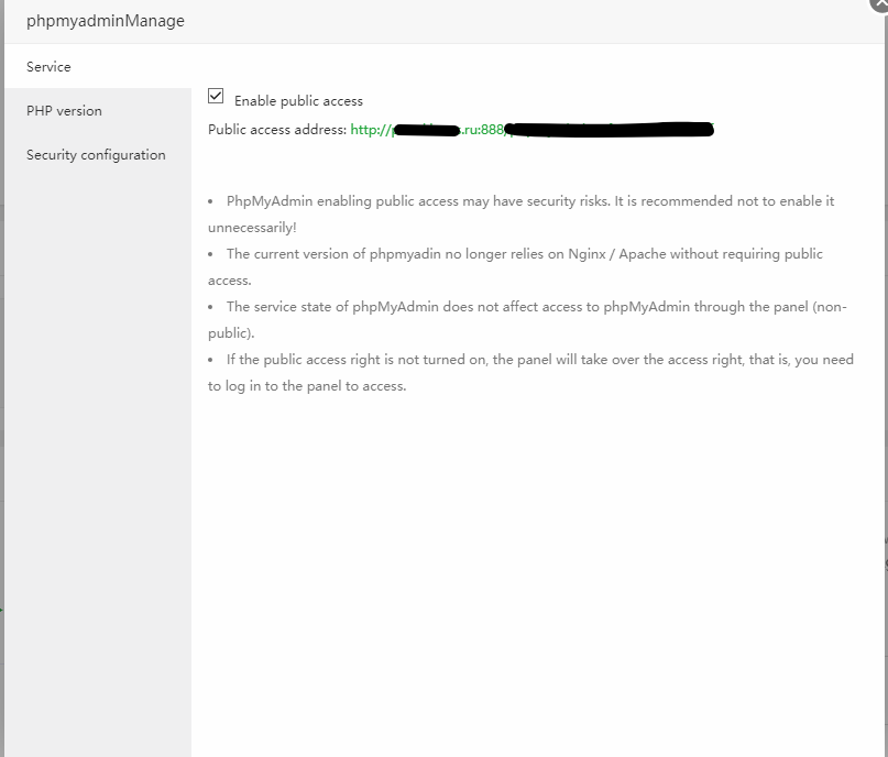 aapanel_power IRBIS Hey, it's like this. When phpmyadmin uses the https url to access, it uses port 887, and http access uses port 888.