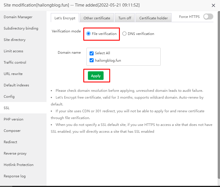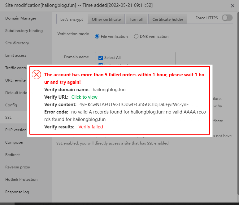 aaPanel_Kern mjste3n Hello, to apply for SSL, the SSL provider needs to access port 80 of your website, the ip of the domain name resolution is the intranet address, and the provider cannot access it. So the application failed.