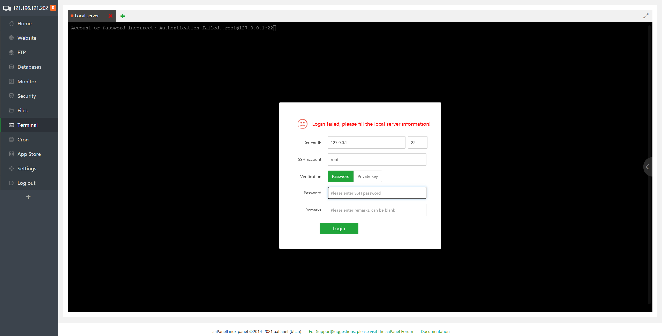 aaP_rahul_dagli I'm trying to connect to the ssh terminal. However, it is giving an error message login failed. I tried logging in using aaPanel login credentials however, its not working. How do I reset the SSH password from aaPanel?