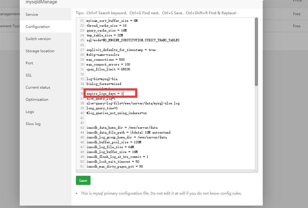 the question: how do i disable or set mysql bin to be deleted in 2 days?