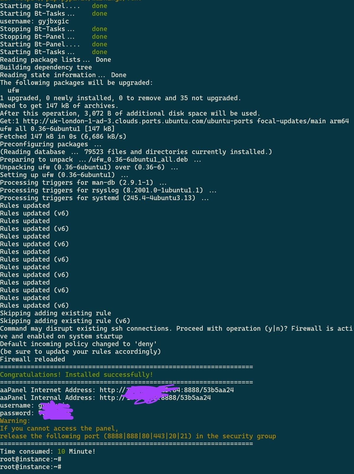 I have installed aapanel on Ubuntu 18.04 and 20.04, the installation done successfully and I have opened all the needed port, however I'm not able to access the panel and when I checked the IP address I found that port 8888 is closed!