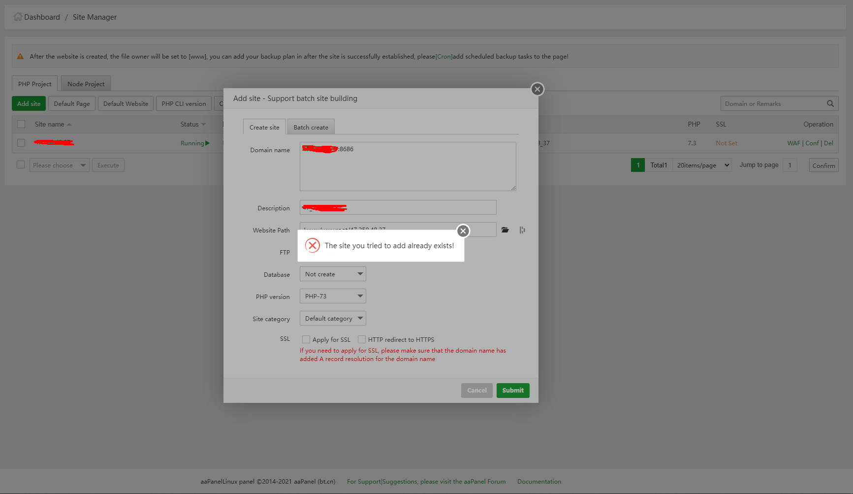 i've tried add site using ip_public:81 but it return "the site you tried to add already exists"