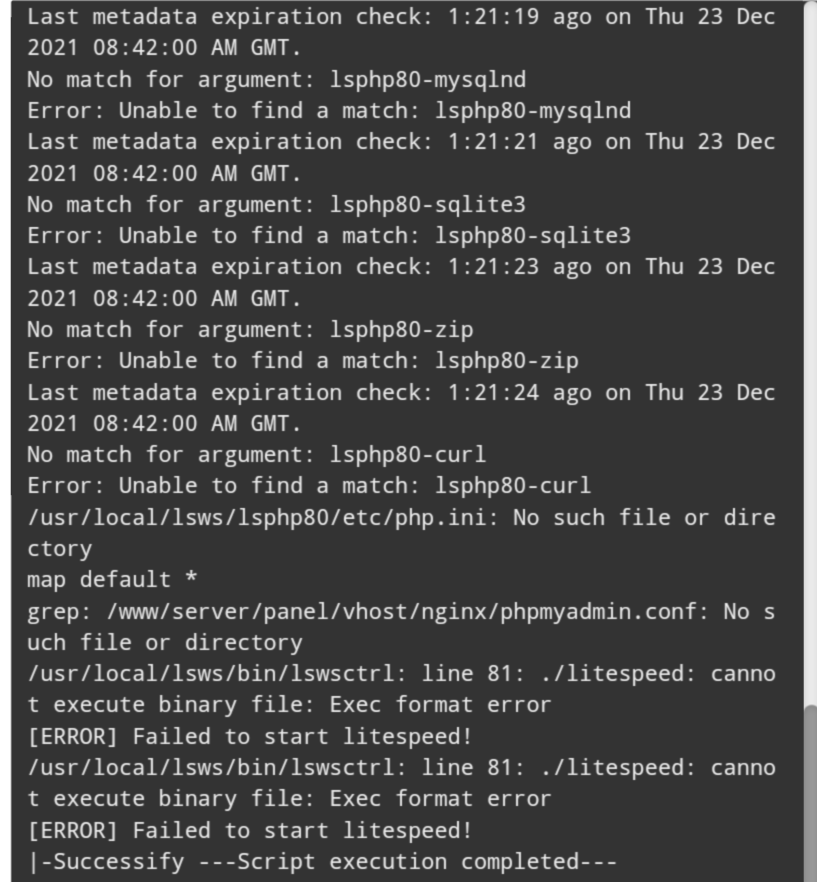 /usr/local/lsws/bin/lswsctrl: line 81: ./litespeed: cannot execute binary file: Exec format error