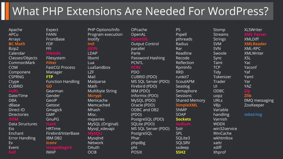 9 official PHP extensions for fallback functions (orange)