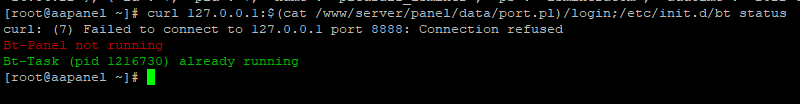 zuantou cesarcoronel I want to make sure your panel service is working curl 127.0.0.1:$(cat /www/server/panel/data/port.pl)/login;/etc/init.d/bt status