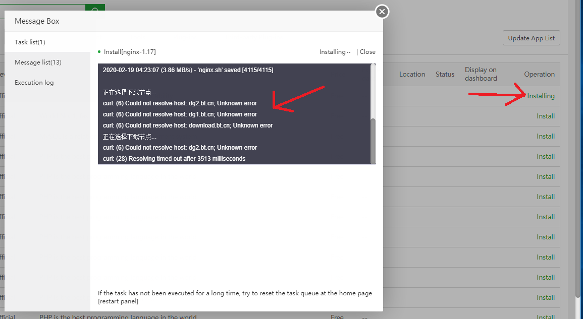 xeizienth Hello, Install centos 7.x version again and use below codes, echo "103.224.251.67 download.bt.cn" >> /etc/hosts curl -sSO http://www.aapanel.com/script/new_install_en.sh && bash new_install_en.sh